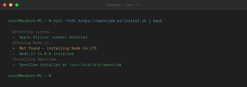 Open Terminal and paste this command. It automatically installs OpenClaw along with the right version of Node.js for your M2 chip.