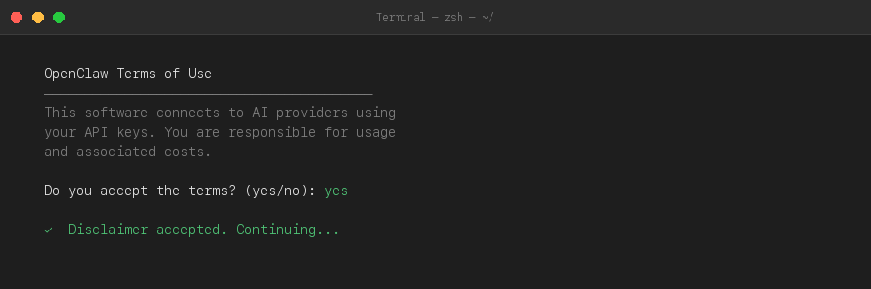 OpenClaw disclaimer screen in Terminal