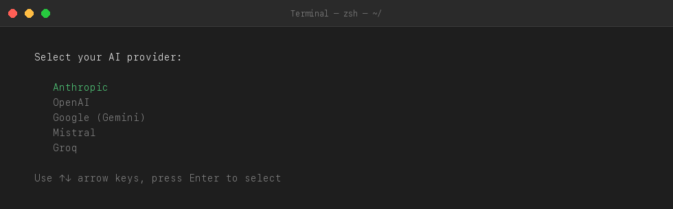 You will see a list of AI providers. Use the arrow keys to pick one — for example Anthropic, OpenAI, or Google — then press Enter.