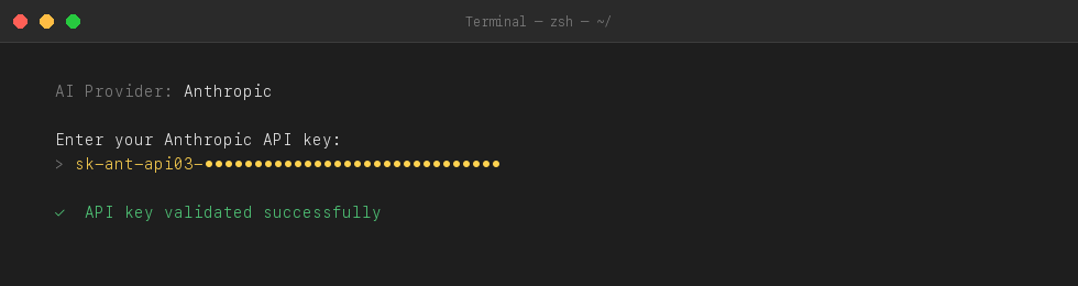 Copy your API key from your provider dashboard and paste it when asked. The key will not be visible as you type — that is normal.