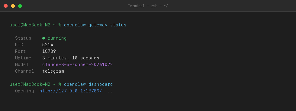 You should see the gateway running with a PID and port number. Open the web dashboard to manage your agent from a browser: