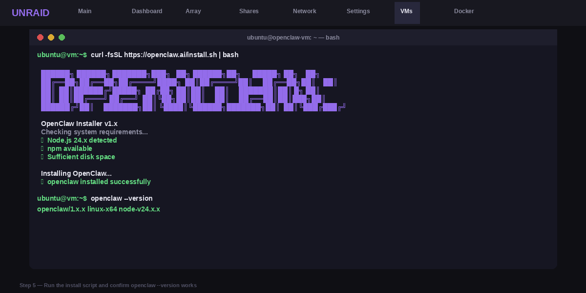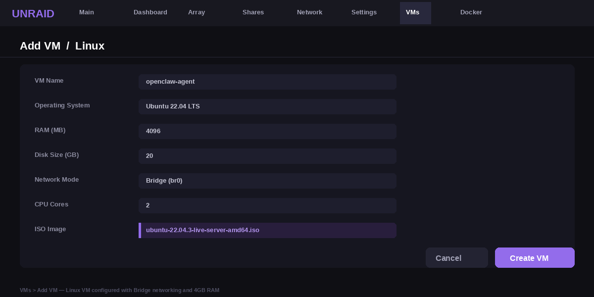 Unraid wipes any software you install directly when it restarts. So you put OpenClaw inside a small Linux virtual machine instead. That keeps your agent running safely across every reboot.