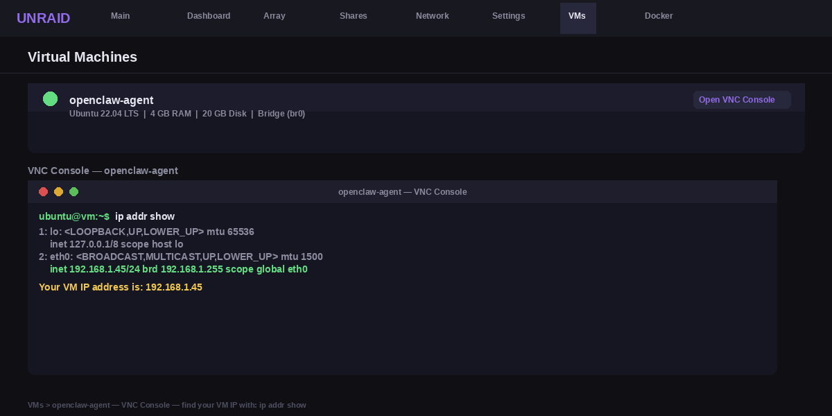 In the Unraid VMs tab, click on your VM and open the VNC console. This is like a screen and keyboard for your VM. You can also SSH into the VM from your computer if you prefer. To find the VM IP address run: