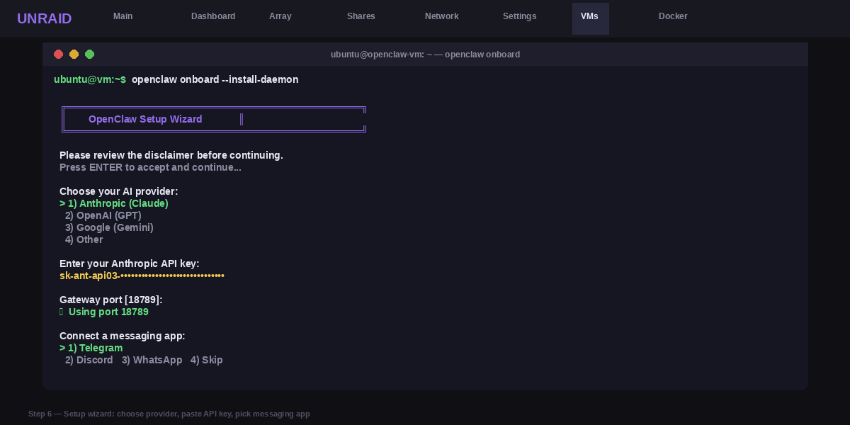 Run the setup command again and this time make sure to include the --install-daemon part at the end. This tells OpenClaw to keep running automatically every time the VM starts up.