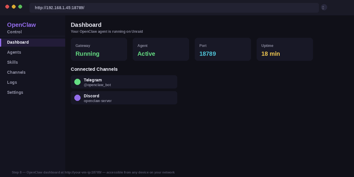 You can view and manage OpenClaw from a web dashboard. Run this command inside the VM to open it, or go to the URL below from any browser on your home network: