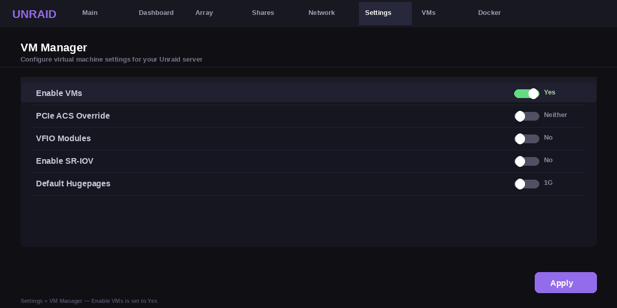 Log into your Unraid dashboard and go to the top menu. Click Settings, then click VM Manager. Look for the option that says Enable VMs and set it to Yes. Click Apply to save.